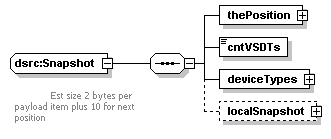 source | <xs:complexType name="Snapshot"> <xs:annotation> <xs:documentation> Est size 2 bytes per payload item plus 10 for next position </xs:documentation> </xs:annotation> <xs:sequence> <xs:element name="thePosition" type="FullPositionVector"/> <!-- data of the position and speed, --> <xs:element name="cntVSDTs"> <xs:simpleType> <xs:restriction base="xs:unsignedByte"> <xs:maxInclusive value="31"/> </xs:restriction> </xs:simpleType> </xs:element> <!-- a count of how many vehicle status device type entires will follow, 1 byte --> <xs:element name="deviceTypes"> <xs:complexType> <xs:sequence minOccurs="0" maxOccurs="31"> <xs:element name="deviceType" type="SnapshotItem"/> <!-- a seq of name-value pairs which me may encode in the style as other msgs, need to see --> </xs:sequence> </xs:complexType> </xs:element> <xs:element name="localSnapshot" type="local:Snapshot" minOccurs="0"/> </xs:sequence> </xs:complexType> |