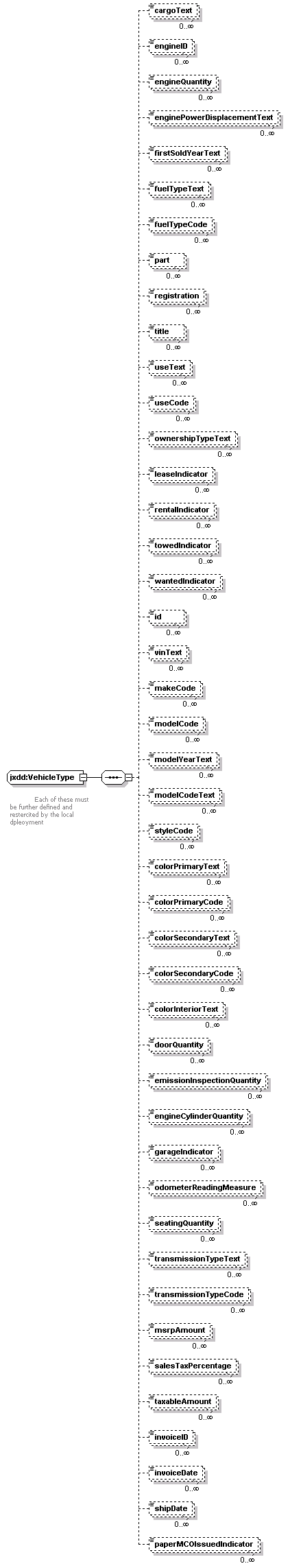 source | <xs:complexType name="VehicleType"> <xs:annotation> <xs:documentation> Each of these must be further defined and restercited by the local dpleoyment </xs:documentation> </xs:annotation> <xs:sequence> <!-- builds from SuperType in the JXDD effort --> <xs:element name="cargoText" type="VehicleCargoText" minOccurs="0" maxOccurs="unbounded"/> <xs:element name="engineID" type="VehicleEngineID" minOccurs="0" maxOccurs="unbounded"/> <xs:element name="engineQuantity" type="VehicleEngineQuantity" minOccurs="0" maxOccurs="unbounded"/> <xs:element name="enginePowerDisplacementText" type="VehicleEnginePowerDisplacementText" minOccurs="0" maxOccurs="unbounded"/> <xs:element name="firstSoldYearText" type="VehicleFirstSoldYearText" minOccurs="0" maxOccurs="unbounded"/> <xs:element name="fuelTypeText" type="VehicleFuelTypeText" minOccurs="0" maxOccurs="unbounded"/> <xs:element name="fuelTypeCode" type="VehicleFuelTypeCode" minOccurs="0" maxOccurs="unbounded"/> <xs:element name="part" type="VehiclePart" minOccurs="0" maxOccurs="unbounded"/> <xs:element name="registration" type="VehicleRegistration" minOccurs="0" maxOccurs="unbounded"/> <xs:element name="title" type="VehicleTitle" minOccurs="0" maxOccurs="unbounded"/> <xs:element name="useText" type="VehicleUseText" minOccurs="0" maxOccurs="unbounded"/> <xs:element name="useCode" type="VehicleUseCode" minOccurs="0" maxOccurs="unbounded"/> <xs:element name="ownershipTypeText" type="VehicleOwnershipTypeText" minOccurs="0" maxOccurs="unbounded"/> <xs:element name="leaseIndicator" type="VehicleLeaseIndicator" minOccurs="0" maxOccurs="unbounded"/> <xs:element name="rentalIndicator" type="VehicleRentalIndicator" minOccurs="0" maxOccurs="unbounded"/> <xs:element name="towedIndicator" type="VehicleTowedIndicator" minOccurs="0" maxOccurs="unbounded"/> <xs:element name="wantedIndicator" type="VehicleWantedIndicator" minOccurs="0" maxOccurs="unbounded"/> <xs:element name="id" type="VehicleID" minOccurs="0" maxOccurs="unbounded"/> <xs:element name="vinText" type="VehicleVINAText" minOccurs="0" maxOccurs="unbounded"/> <xs:element name="makeCode" type="VehicleMakeCode" minOccurs="0" maxOccurs="unbounded"/> <xs:element name="modelCode" type="VehicleModelCode" minOccurs="0" maxOccurs="unbounded"/> <xs:element name="modelYearText" type="VehicleModelYearText" minOccurs="0" maxOccurs="unbounded"/> <xs:element name="modelCodeText" type="VehicleModelCodeText" minOccurs="0" maxOccurs="unbounded"/> <xs:element name="styleCode" type="VehicleStyleCode" minOccurs="0" maxOccurs="unbounded"/> <xs:element name="colorPrimaryText" type="VehicleColorPrimaryText" minOccurs="0" maxOccurs="unbounded"/> <xs:element name="colorPrimaryCode" type="VehicleColorPrimaryCode" minOccurs="0" maxOccurs="unbounded"/> <xs:element name="colorSecondaryText" type="VehicleColorSecondaryText" minOccurs="0" maxOccurs="unbounded"/> <xs:element name="colorSecondaryCode" type="VehicleColorSecondaryCode" minOccurs="0" maxOccurs="unbounded"/> <xs:element name="colorInteriorText" type="VehicleColorInteriorText" minOccurs="0" maxOccurs="unbounded"/> <xs:element name="doorQuantity" type="VehicleDoorQuantity" minOccurs="0" maxOccurs="unbounded"/> <xs:element name="emissionInspectionQuantity" type="VehicleEmissionInspectionQuantity" minOccurs="0" maxOccurs="unbounded"/> <xs:element name="engineCylinderQuantity" type="VehicleEngineCylinderQuantity" minOccurs="0" maxOccurs="unbounded"/> <xs:element name="garageIndicator" type="VehicleGarageIndicator" minOccurs="0" maxOccurs="unbounded"/> <xs:element name="odometerReadingMeasure" type="VehicleOdometerReadingMeasure" minOccurs="0" maxOccurs="unbounded"/> <xs:element name="seatingQuantity" type="VehicleSeatingQuantity" minOccurs="0" maxOccurs="unbounded"/> <xs:element name="transmissionTypeText" type="VehicleTransmissionTypeText" minOccurs="0" maxOccurs="unbounded"/> <xs:element name="transmissionTypeCode" type="VehicleTransmissionTypeCode" minOccurs="0" maxOccurs="unbounded"/> <xs:element name="msrpAmount" type="VehicleMSRPAmount" minOccurs="0" maxOccurs="unbounded"/> <xs:element name="salesTaxPercentage" type="VehicleSalesTaxPercentage" minOccurs="0" maxOccurs="unbounded"/> <xs:element name="taxableAmount" type="VehicleTaxableAmount" minOccurs="0" maxOccurs="unbounded"/> <xs:element name="invoiceID" type="VehicleInvoiceID" minOccurs="0" maxOccurs="unbounded"/> <xs:element name="invoiceDate" type="VehicleInvoiceDate" minOccurs="0" maxOccurs="unbounded"/> <xs:element name="shipDate" type="VehicleShipDate" minOccurs="0" maxOccurs="unbounded"/> <xs:element name="paperMCOIssuedIndicator" type="VehiclePaperMCOIssuedIndicator" minOccurs="0" maxOccurs="unbounded"/> </xs:sequence> </xs:complexType> |