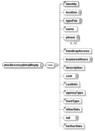 source | <xs:complexType name="DirectoryDetailReply"> <xs:sequence> <xs:element name="identity" type="Identity"/> <xs:element name="location" type="lrms:LocationReference" minOccurs="0"/> <xs:element name="typePair" type="DirectoryTypePair"/> <xs:element name="name" type="Name" minOccurs="0"/> <xs:element name="phone" type="PhoneInformation" minOccurs="0" maxOccurs="10"/> <xs:element name="handicapAccess" type="ADA-Access" minOccurs="0"/> <xs:element name="businessHours" type="TimePair" minOccurs="0"/> <xs:element name="description" type="Description" minOccurs="0"/> <xs:element name="cost" type="Cost" minOccurs="0"/> <xs:element name="costInfo" type="Freetext" minOccurs="0"/> <xs:element name="agencyType" type="GovernmentSubType" minOccurs="0"/> <xs:element name="foodType" type="RestaurantSubType" minOccurs="0"/> <xs:element name="otherData" type="ExtendedInfo" minOccurs="0"/> <xs:element name="tail" type="Tail" minOccurs="0"/> <xs:element name="furtherData" type="URL-Link" minOccurs="0"/> </xs:sequence> </xs:complexType> |