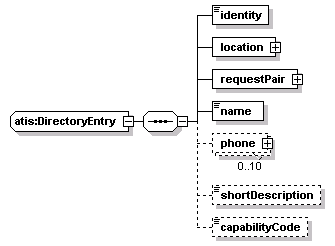 source | <xs:complexType name="DirectoryEntry"> <xs:sequence> <xs:element name="identity" type="Identity"/> <xs:element name="location" type="lrms:LocationReference"/> <xs:element name="requestPair" type="DirectoryTypePair"/> <xs:element name="name" type="Name"/> <xs:element name="phone" type="PhoneInformation" minOccurs="0" maxOccurs="10"/> <xs:element name="shortDescription" type="ShortDescription" minOccurs="0"/> <xs:element name="capabilityCode" type="CapabilityCode" minOccurs="0"/> </xs:sequence> </xs:complexType> |