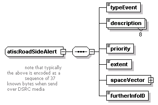 source | <xs:complexType name="RoadSideAlert"> <xs:annotation> <xs:documentation> note that typically the above is encoded as a sequence of 37 known bytes when send over DSRC media </xs:documentation> </xs:annotation> <xs:sequence> <xs:element name="typeEvent"> <xs:simpleType> <xs:restriction base="itis:ITIScodes"/> </xs:simpleType> </xs:element> <!-- a category and an item from that category all ITS stds use the same types here to explain the type of the alert / danger / hazard involved two bytes in length --> <xs:element name="description" type="itis:ITIScodes" minOccurs="8" maxOccurs="8"/> <!-- eight ITIS code entries to further describe the event , give advice , or any other ITIS codes non used positions are set to zero 16 bytes in length --> <xs:element name="priority" type="Priority"/> <!-- the urgency of this message, a relative degree of merit compared with other similar messages for this type (not other message being sent by the device) , nor a priority of display urgency one byte in length --> <xs:element name="extent" type="Extent"/> <!-- the spatial distance over which this message applies and should be presented to the driver one byte in length --> <xs:element name="spaceVector" type="SpaceVector"/> <!-- a compact summary of the position, heading, rate of speed, etc of the event in question. Including stationary and wide area events. 15 bytes in length --> <xs:element name="furtherInfoID" type="FurtherInfoID"/> <!-- a link to any other incident information data that may be available in the normal ATIS incident description or other messages two bytes in length --> </xs:sequence> </xs:complexType> |