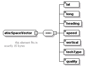 source | <xs:complexType name="SpaceVector"> <xs:annotation> <xs:documentation> this element fits in exactly 15 bytes </xs:documentation> </xs:annotation> <xs:sequence> <xs:element name="lat" type="lrms:Latitude"/> <!-- a 4 byte value --> <xs:element name="long" type="lrms:Longitude"/> <!-- a 4 byte value --> <xs:element name="heading" type="Heading"/> <!-- a 1 byte value from geoids north --> <xs:element name="speed" type="Speed"/> <!-- a 2 byte field in units of 0.01 meters per second --> <xs:element name="vertical" type="Elevation"/> <!-- 3 byte field --> <xs:element name="techType" type="Location-tech"/> <!-- how the position was obtained, acts as a relative measure of merit from [SAE-J2313::Location-tech] --> <xs:element name="quality" type="Location-quality"/> <!-- estimate of accuracy for this location from [SAE-J2313::Location-quality] above two items form one 8 bit field --> </xs:sequence> </xs:complexType> |