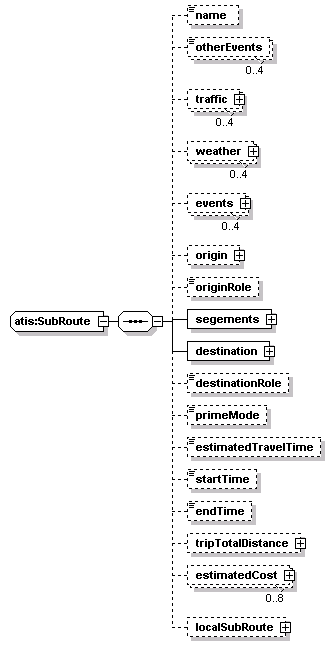 source | <xs:complexType name="SubRoute"> <xs:sequence> <xs:element name="name" minOccurs="0"> <xs:simpleType> <xs:restriction base="xs:string"> <xs:minLength value="1"/> <xs:maxLength value="64"/> </xs:restriction> </xs:simpleType> </xs:element> <xs:element name="otherEvents" type="im:ReferenceID" minOccurs="0" maxOccurs="4"/> <xs:element name="traffic" type="LinkTrafficInformation" minOccurs="0" maxOccurs="4"/> <xs:element name="weather" type="WeatherInformation" minOccurs="0" maxOccurs="4"/> <xs:element name="events" type="ResponseGroup" minOccurs="0" maxOccurs="4"/> <xs:element name="origin" type="lrms:PointLocation" minOccurs="0"/> <xs:element name="originRole" type="PointRole" minOccurs="0"/> <xs:element name="segements"> <xs:complexType> <xs:sequence maxOccurs="50"> <xs:element name="segement" type="Segment"/> </xs:sequence> </xs:complexType> </xs:element> <xs:element name="destination" type="lrms:PointLocation"/> <xs:element name="destinationRole" type="PointRole" minOccurs="0"/> <xs:element name="primeMode" type="Mode" minOccurs="0"/> <!-- primary mode of travel --> <xs:element name="estimatedTravelTime" type="TimeInterval" minOccurs="0"/> <xs:element name="startTime" type="DateTimePair" minOccurs="0"/> <xs:element name="endTime" type="DateTimePair" minOccurs="0"/> <xs:element name="tripTotalDistance" type="lrms:Distance" minOccurs="0"/> <xs:element name="estimatedCost" type="ComplexCost" minOccurs="0" maxOccurs="8"/> <xs:element name="localSubRoute" type="local:SubRoute" minOccurs="0"/> </xs:sequence> </xs:complexType> |