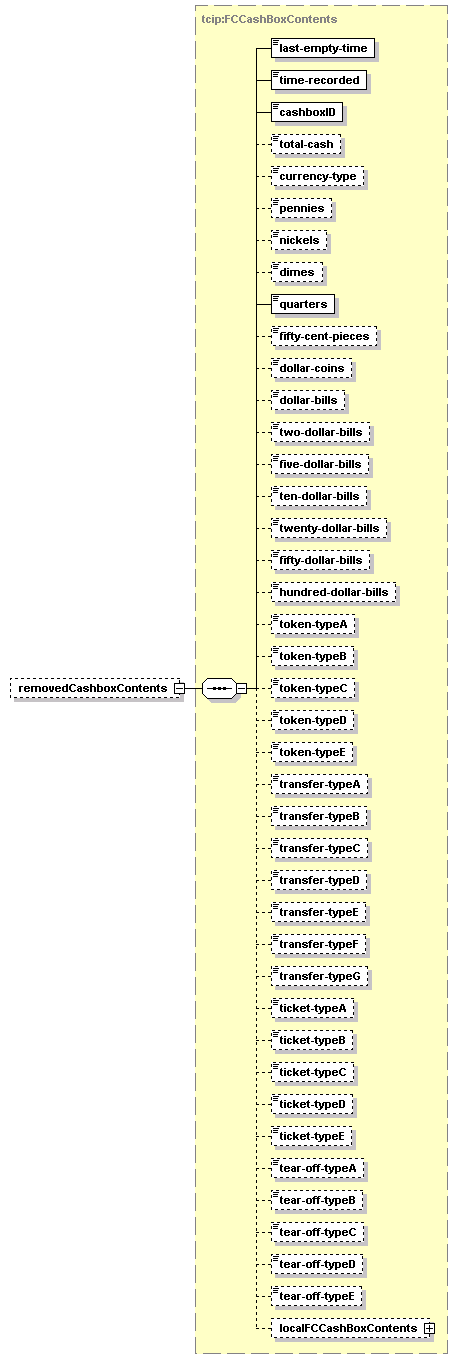 children | last-empty-time time-recorded cashboxID total-cash currency-type pennies nickels dimes quarters fifty-cent-pieces dollar-coins dollar-bills two-dollar-bills five-dollar-bills ten-dollar-bills twenty-dollar-bills fifty-dollar-bills hundred-dollar-bills token-typeA token-typeB token-typeC token-typeD token-typeE transfer-typeA transfer-typeB transfer-typeC transfer-typeD transfer-typeE transfer-typeF transfer-typeG ticket-typeA ticket-typeB ticket-typeC ticket-typeD ticket-typeE tear-off-typeA tear-off-typeB tear-off-typeC tear-off-typeD tear-off-typeE localFCCashBoxContents | ||||||||