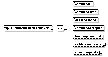 source | <xs:complexType name="FcCommandEnableEquipAck"> <xs:sequence> <xs:element name="commandID" type="CPT-CommandID"/> <xs:element name="command-time" type="CPT-DateTime"/> <xs:element name="exit-free-mode" type="CPT-Boolean"/> <xs:element name="command-accepted" type="CPT-Boolean"/> <xs:element name="time-implemented" type="CPT-DateTime" minOccurs="0"/> <xs:element name="exit-free-mode-ids" minOccurs="0"> <xs:complexType> <xs:sequence maxOccurs="1000"> <xs:element name="exit-free-mode-id" type="CPT-SerialNumber"/> </xs:sequence> </xs:complexType> </xs:element> <xs:element name="resume-ops-ids" minOccurs="0"> <xs:complexType> <xs:sequence maxOccurs="1000"> <xs:element name="resume-ops-id" type="CPT-SerialNumber"/> </xs:sequence> </xs:complexType> </xs:element> </xs:sequence> </xs:complexType> |