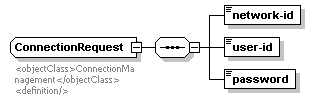 | source | <xs:complexType name="ConnectionRequest"> <xs:annotation> <xs:documentation> <objectClass>ConnectionManagement</objectClass> <definition/> </xs:documentation> </xs:annotation> <xs:sequence> <xs:element name="network-id" type="Organization-resource-identifier"/> <xs:element name="user-id" type="Organization-resource-identifier"/> <xs:element name="password" type="Organization-resource-identifier"/> </xs:sequence> </xs:complexType> |